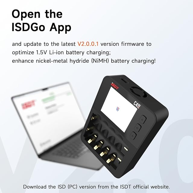 ISDGo APPアプリの最新V2.0.0.1ファームウェアを更新して、1.5Vリチウムイオン電池(Li-ion)の充電を最適化し、ニッケル水素電池(NiMH)の充電性能を向上! ISDGo APPアプリを最新のV2.0.0.1バージョンにアップデートしてください。これにより、1.5Vリチウムイオン電池(Li-ion)の充電が最適化され、ニッケル水素電池(NiMH)の充電性能が大幅に向上します。 更新方法: ISDT公式ウェブサイトから最新のV2.0.0.1ファームウェアをダウンロードしてください。 ダウンロード後、アプリを起動して更新を適用してください。