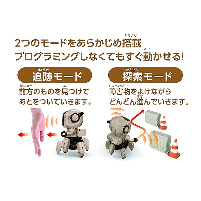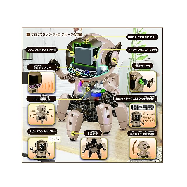 ・パソコンでプログラミングを作成、転送したプログラムでロボットを制御 ・プログラミングはアイコンを並べるだけ直感的な操作 ・ロボット工作キット ・イラスト豊富で分かりやすい説明書付き ・完成サイズ(約):幅150×奥150×高175mm ・パッケージサイズ(約):幅375×奥75×高235mm