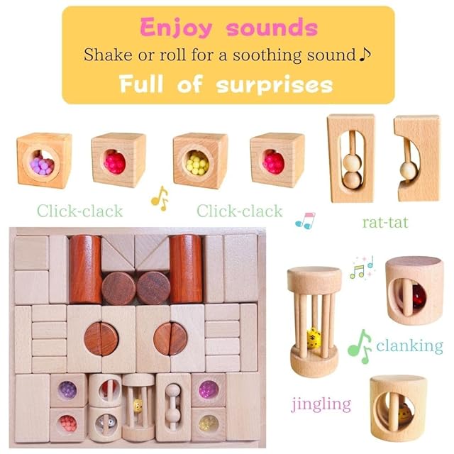 tanoshimu 積み木 知育玩具 おもちゃ 音が鳴る積み木 1歳 2歳 3歳 誕生日 クリスマス プレゼント 出産祝い 入園 お祝い 学習 指先知育 モンテッソーリ 教育玩具 無着色 ブナ材 (42pcsグレードアップ
