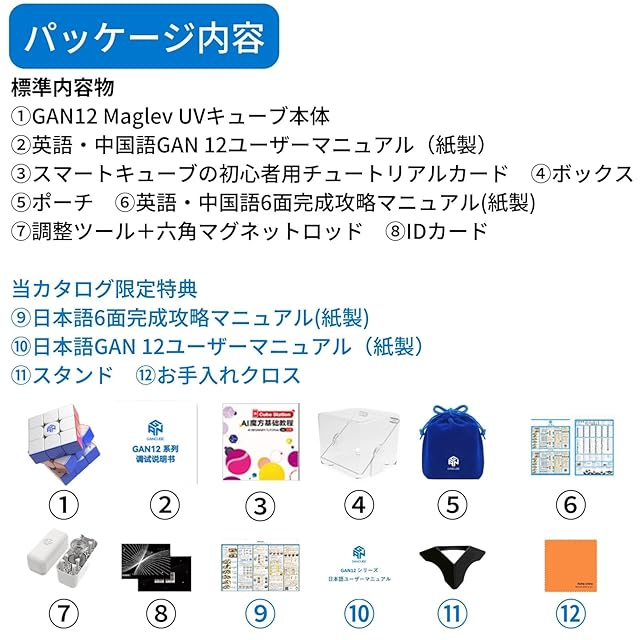 ✅【充実のパッケージ内容】標準内容物【①GAN12 Maglev UVキューブ本体 ②ユーザーマニュアル(英語・中国語) ③スマートキューブの初心者用チュートリアルカード ④ボックス ⑤ポーチ ⑥6面完成攻略マニュアル(英語・中国語) ⑦調整ツール+六角マグネットロッド ⑧IDカード】に加え、当カタログ限定特典として【⑨6面完成攻略マニュアル(日本語) ⑩ユーザーマニュアル(日本語)⑪スタンド ⑫お手入れクロス】が付属します。