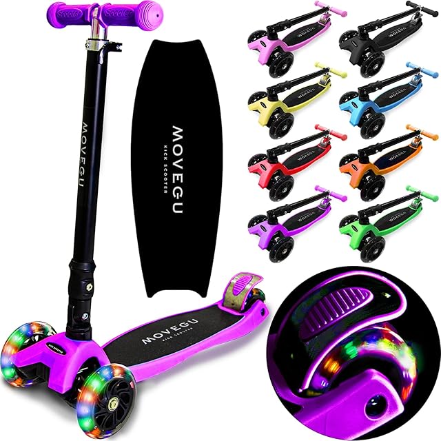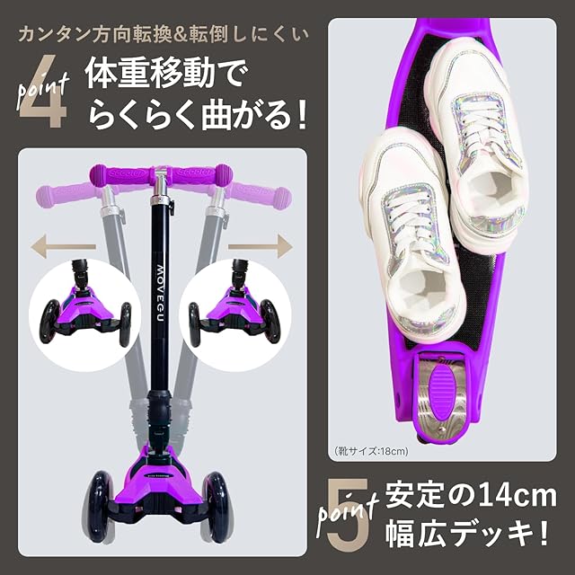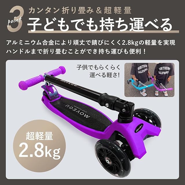 キックスクーター キックボード 子供用 三輪車 4段階高さ調整 軽量 頑丈 方向変換 安定 光るLEDタイヤ 折りたたみ 方向変換 持ち運び便利 耐荷重50kg 後輪ブレーキ 誕生日 プレゼント おもちゃ ギフト キッズ MOVEGU 2022FW (Purple2022FW)