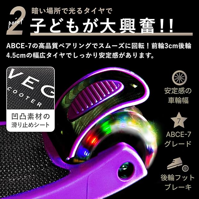 【LED 光るホイール・フットブレーキ】バッテリーが必要なく、速度によってホイールが回転することで自動的にきらきら光るので、夕方でも子供の走行が目立って安心です。車輪の素材は耐摩耗性と耐荷重性に優れる高反発PUを採用し、走行中の音は小さく、振動感も少ない滑らかな走りです。