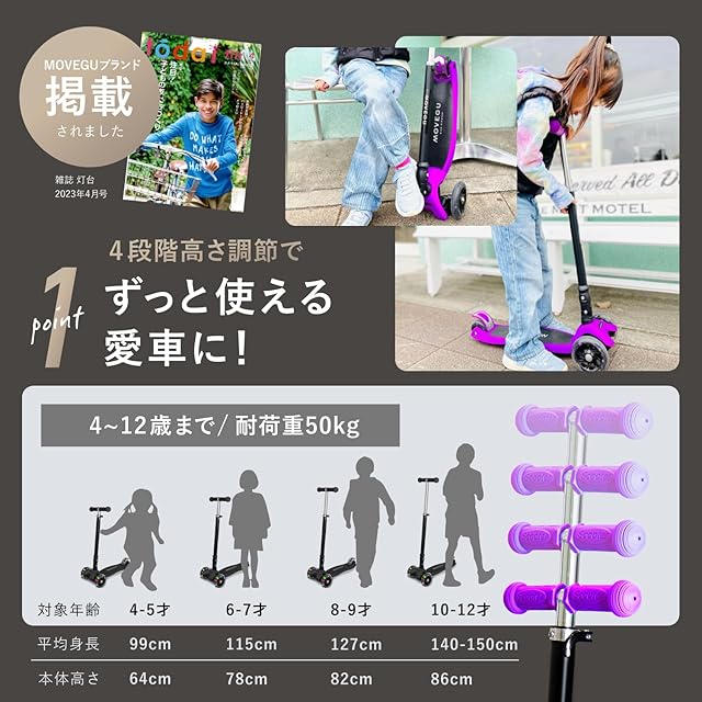 【4段階高さ調節可能・方向転換しやすい】軽量かつ頑丈なボディのキックスクーターです。子供の身長により、64cm、78cm、82cm、86cmの4段階に調節できます。適用年齢:4歳〜12歳。車体を傾けることによって方向転換が可能な機構を採用。操作性を高めることで子供の転倒を未然に防ぎます。
