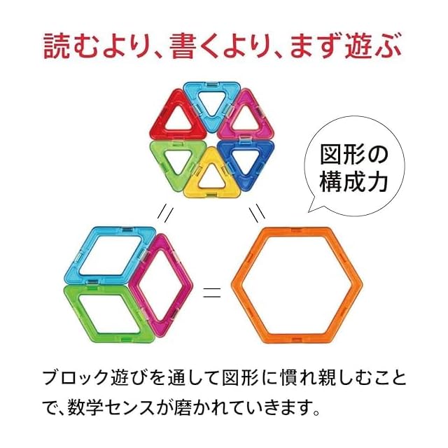 【世界63ヶ国で人気沸騰中! 磁石でつながる数学ブロック】くっつけてはなして、自分のセンスを生かしながら、様々な形や世界観をつくれる磁石内蔵のマグネットブロック! 様々な形を組み合わせて、オリジナル作品も作れるおもちゃです。