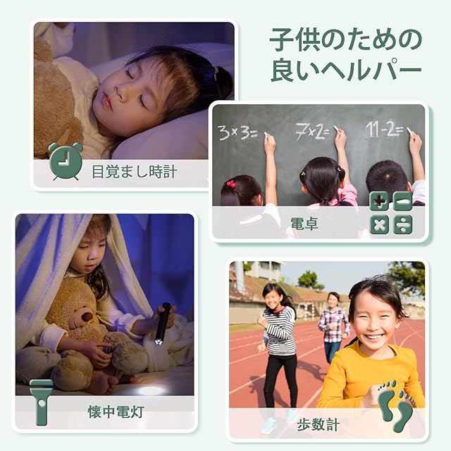 【教育ゲームとアクティビティ:】15種類の教育ゲームとアクティビティゲーム(男の子にはレースゲーム、女の子にはドレスアップゲーム)を搭載したこの大画面モバイルゲーム機は、すべてのお子様に最適な贈り物です。 サウンドアニメーションを含む、とても楽しいインタラクティブな時計です。 楽しいゲームでお子さまの思考力を鍛えることができます。タッチパネルを使ってゲームをしたり、好みに合わせてゲームを選んだりすることができます。 多機能な子供用スマートミニモバイルで、お子様の生活がもっと楽しくなりますね。