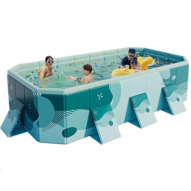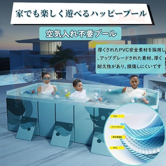 【高品質耐久性大型プール】この 空気入れ不要 大型プールは、複合補強板とPVCで構成されている。PVC複合補強板の生地は最先端の技術で耐摩耗性と防水性が高いため、周囲には複数の三角形の支持板が分布しており、プールの外広がり変形を防止している。