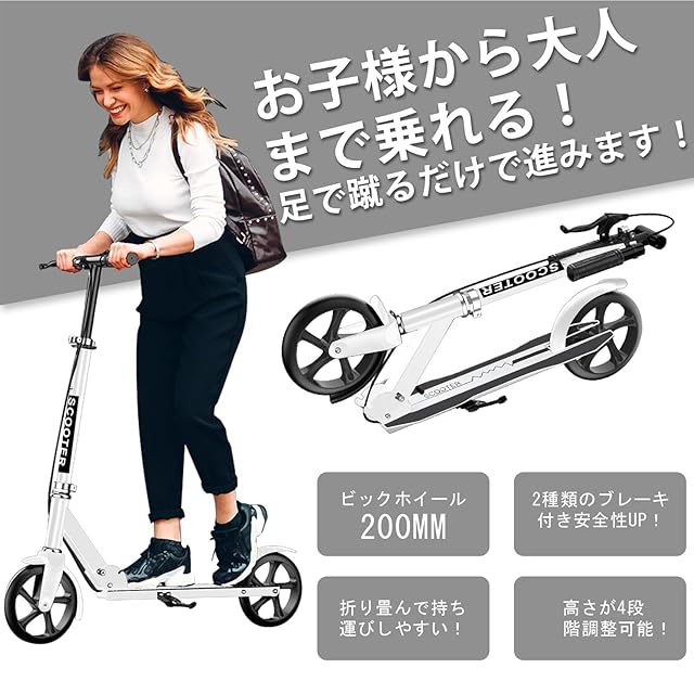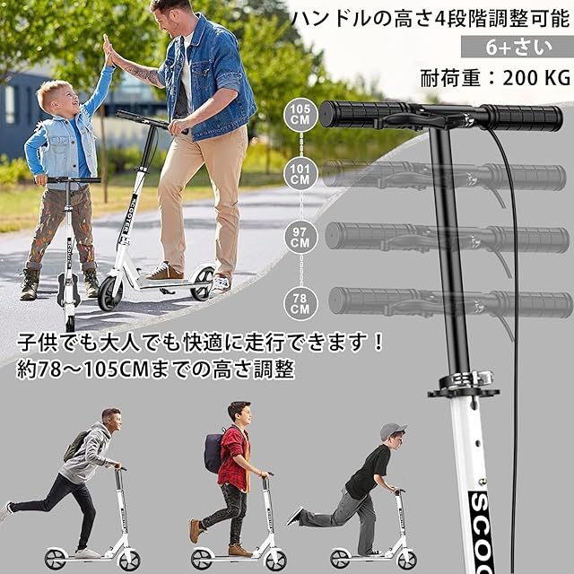 【4段階高さ調節】78、97、101、105cmの4段階の高さに調整できます。子供用としても大人用としても、お子様の成長にあわせて乗り始めからキックボードを卒業するまで楽しく遊べます!幅広い年齢層に適用しています。自分用はもちろん、プレゼントとしても最適です。安心に快適な走りを体感し、何年にわたっても使用に耐えます。