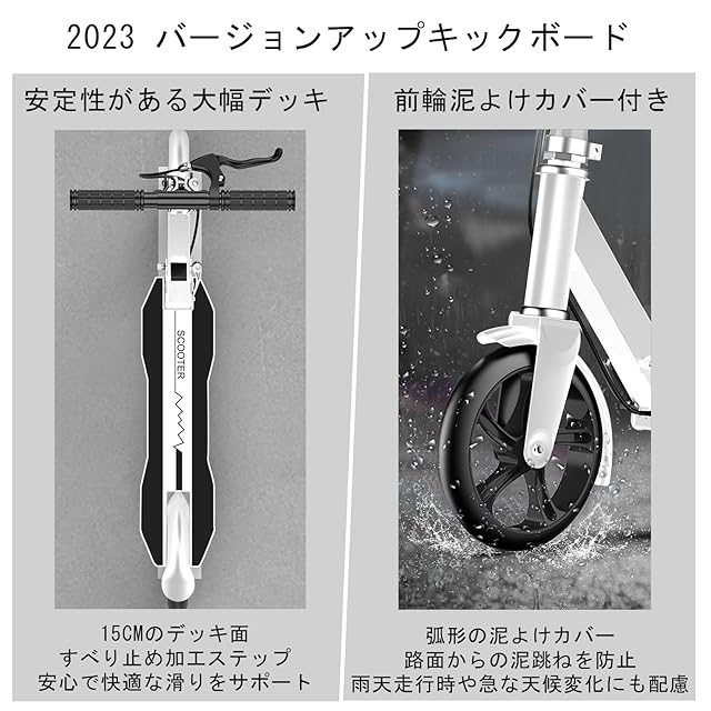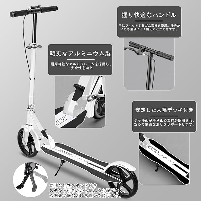 【高品質&安全性UP】本体は軽量で頑丈なアルミボディを採用。デッキ面が滑り止め加工を施したことで、安心で快適な滑りをサポートします。身長の大きな方でも安定する大幅のデッキと、大人の手でも握りやすい長さとグリップ性が強いラバーグリップで乗り心地に特化した、移動に便利なキックボードです。