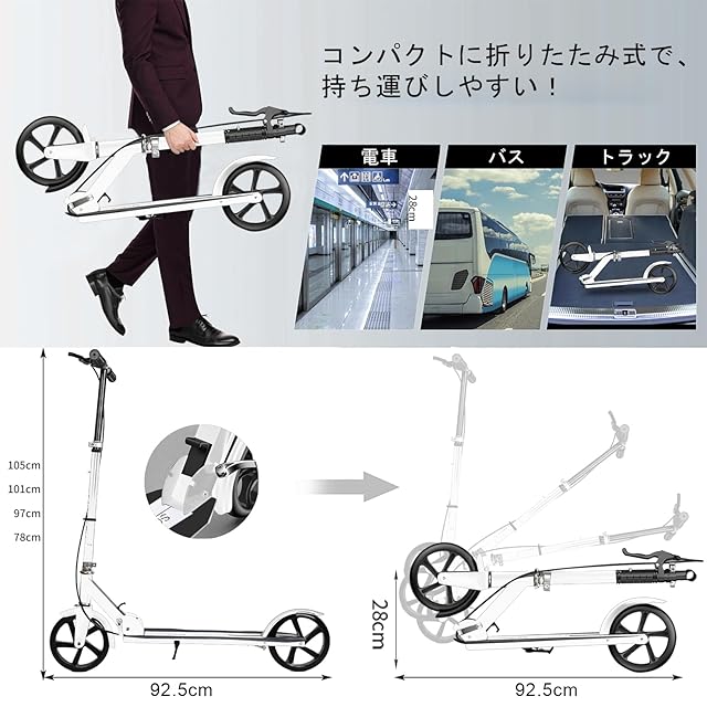 【折り畳み式キックボード】折りたたむことによってキックボード自体がコンパクトになるので、お部屋で保管できるので盗難の心配はなし。持ち運びはやすく、電車やバスに持ち込め、駐輪場などを気にしなく、通勤、通学、買い物などにおすすめします。 自立可能な折りたたみ式スタンドを装備し、置き場に困りません。