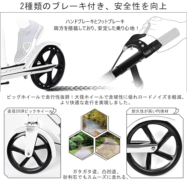 【2種類ブレーキ】フロントブレーキとリアのフットブレーキで高い制動機能を実現。とっさのブレーキにもしっかり対応。軽い力でもしっかりとブレーキを効かせる。雨天などの悪天候時でもブレーキ性能が落ちにくいキックボードです。大人の方も安心して乗って頂ける丈夫な作りで耐荷重は200kg。