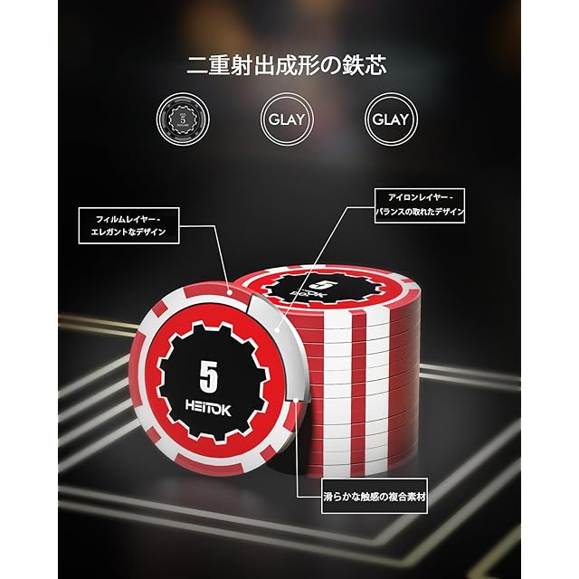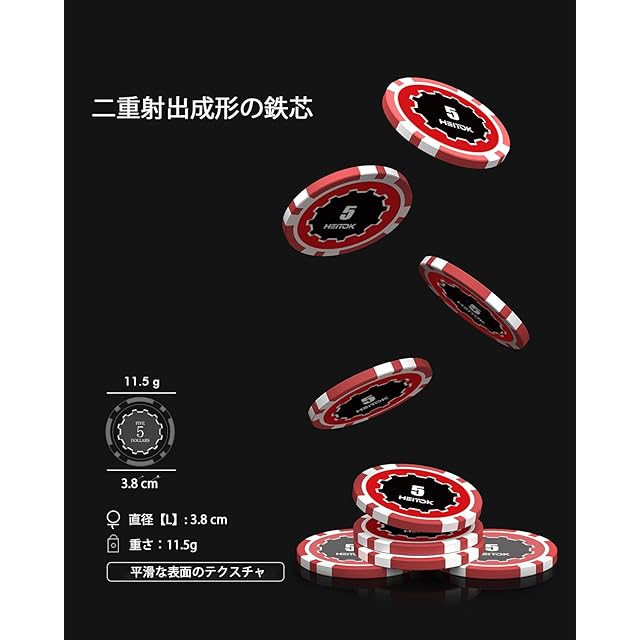 ポーカーチップの材質:ダブルインジェクション鉄複合材で作られ、1枚のチップの重量は11.5g。独特のカジノ体験を提供し、ポーカーの楽しみを新たなレベルに高めます