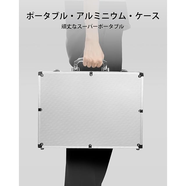 アルミケースのサイズと重量:手提げ用のアルミ製ケースで、丈夫なアルミ素材を使用。長時間の使用にも耐える強度を確保し、耐久性と携帯性を大幅に高めています。ケースのサイズは長さ43.3cm、幅32.8cm、高さ10.2cmで、重量は7kgです