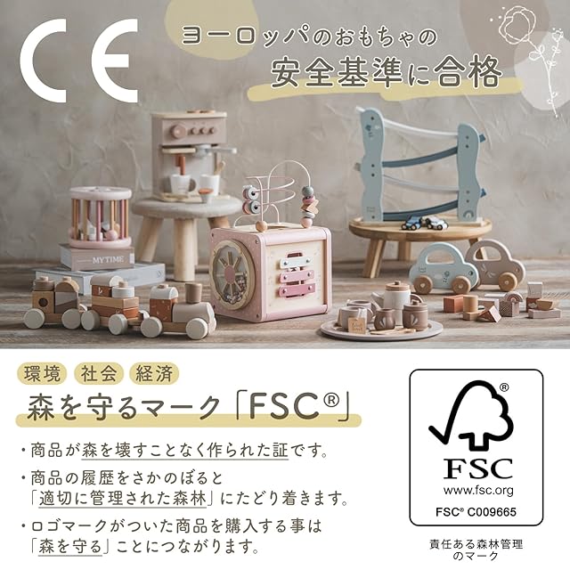 【素材】FSCブナ材、FSC MDF、FSC合板 【安全基準】ヨーロッパの安全基準EN71「CE」および日本の食品衛生法合格