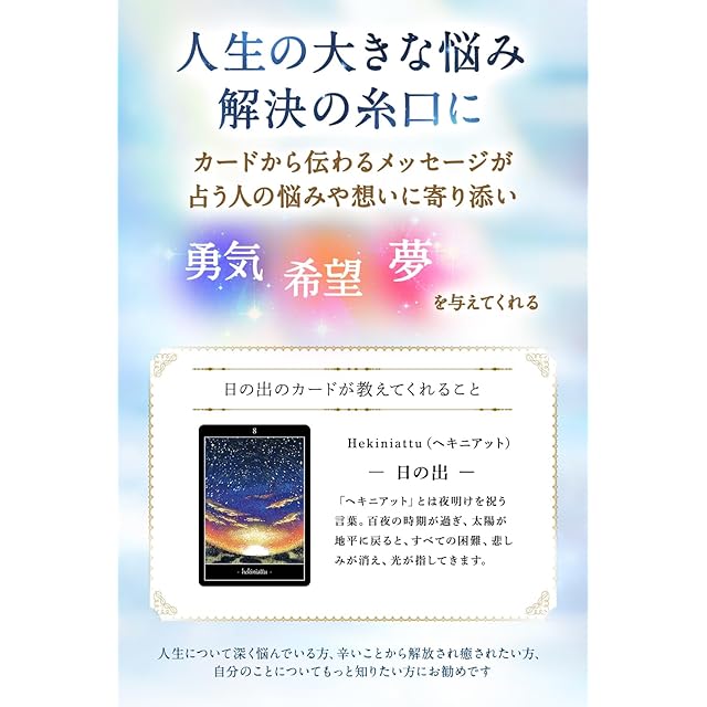 ✅【日本語解説書付き】ジューン澁澤氏による、詳細な解説書が付いています。占い方はもちろん、全80枚のカードごとに「感情・状況・対策」が掲載されているので、カードを1枚引いてキーワードを読むだけで、知りたいことの答えがすぐに分かります。初心者の方でも、お手元に届いた日からすぐに、ご自身で占いができます。