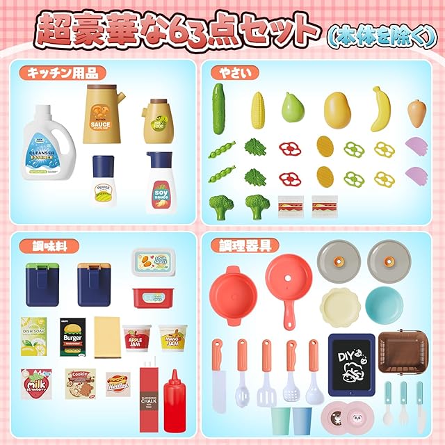 【豪華な64点セット】大きな台所本体、野菜、果物、調味料、キッチン用具、調理器具などバリエーション豊な64点セットで、お子様一人でも 、お友達や家族と一緒に楽しく遊びます。