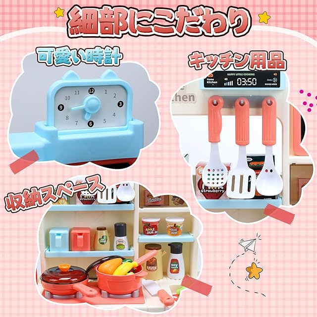【リアルな料理雰囲気】リアルな噴霧、光り、煮音が付いており、本物に負けないぐらいマイキッチンになります。 また、蛇口は実際に水を出すことができます。子供が台所で料理のやり取りを真似し、リアルな気分を味わえ、楽しいままごと遊びを楽しめます。