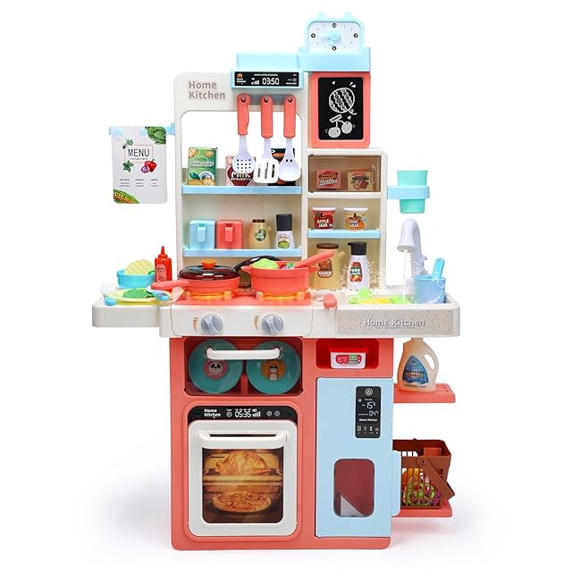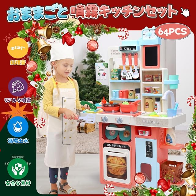 Cute Stone おままごとキッチン 知育玩具 64点 おままごと おもちゃ リアルスプレー ライトと料理音付き 循環出水 組立式 調理器具付き ごっこ遊び 豊富な食材 収納スペース 黒板付き 台所 子供 玩具 誕生日プレゼント