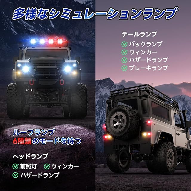 【リアルなシミュレートカーライト効果】 このラジコンカーは、フロントライト、リアライト、ウィンカーライトなど、リアルなシミュレートカーライト効果を備えています。リモコンカーを運転する際に、車のライトが点灯し、運転全体によりリアルな感覚と楽しみをもたらします。