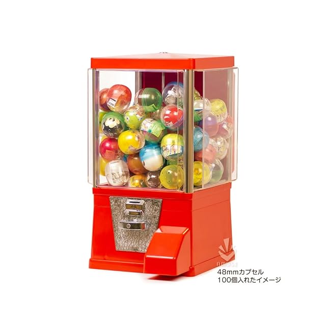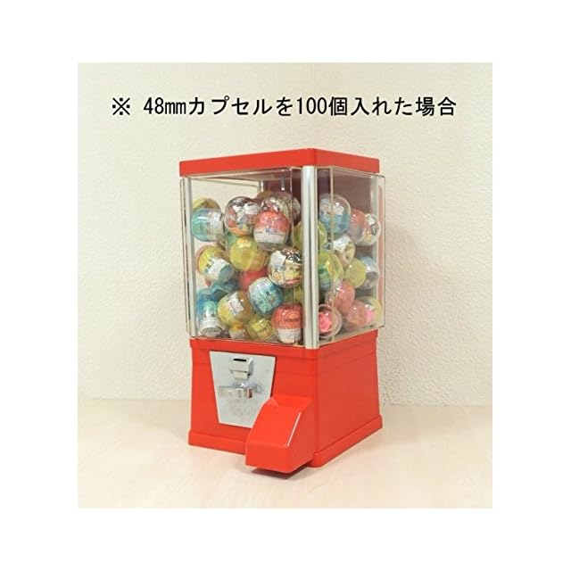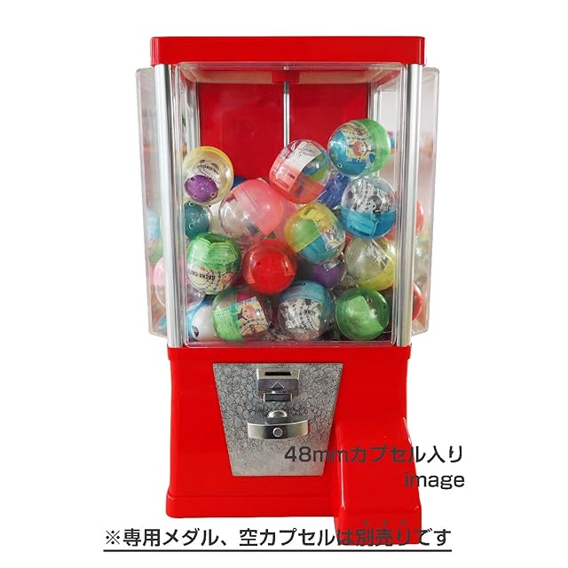 ■本体サイズ(mm) / 230(幅)×300(奥行:取出口含む)×440(高) 平面部 177(幅)×230(高) ■色 / 赤色 ・重 さ / 約5kg ■対応硬貨 / 専用メダルのみ ■対応カプセルサイズ / 48㎜ ・カプセル収納数(適 量) /48mmカプセル100個 ※各サイズともマシンに収納する量は、満タンよりも10~20個少なめに入れてください。すき間無く詰め過ぎると、ハンドルが回しづらかったり、故障の原因にもなります。必ず適量を守ってご利用ください。