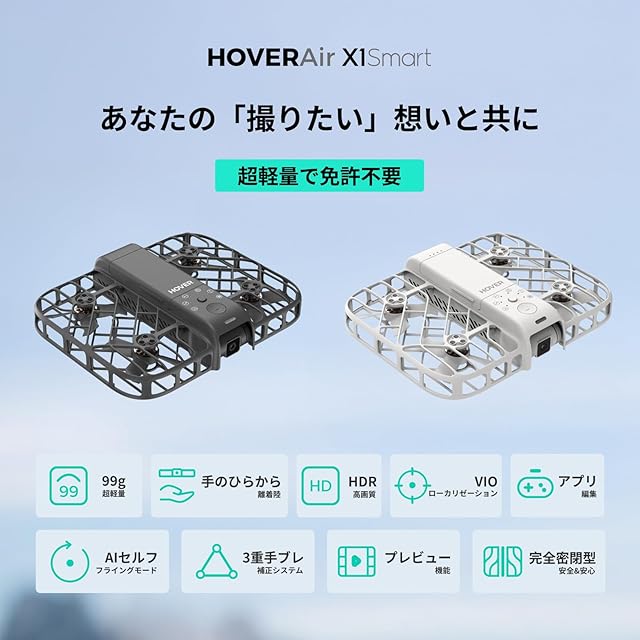【99g、ドローンの免許不要!世界が羨む待望の日本発モデル】わずか99g!機体登録およびドローンの免許が不要で届いたらすぐに楽しめる優れもの!日本での「使いやすさ」を徹底追求したAI飛行カメラ「HOVERAir X1 Smart」は、高度な追跡アルゴリズムと最高8m/sの追跡速度を搭載し、あらゆる動きをシームレスに追跡します。最大飛行高度: 俯瞰モードで15m、その他の飛行モードで10m、最大飛行海抜:推奨2,000m。サイクリングやスケートボードなど、さまざまなスポーツシーンであなたの動きを正確に捉え、記録すべき瞬間を逃しません。サッと取り出して、思い出を美しく残せます。