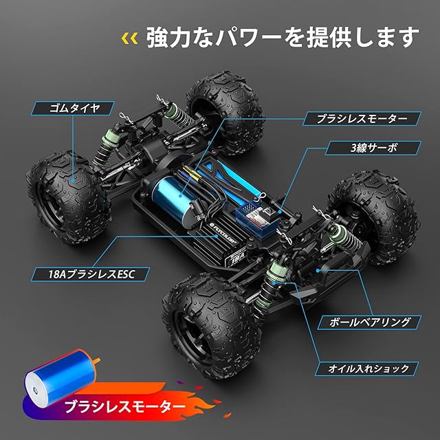 【2440ブラシレスモーター&18 AブラシレスESC】強いブラシレス4300 KVの電動機を備えて、このトラックの速度と寿命は増加します。ブラシレスモーターの寿命はブラシモーターの2〜3倍であり,消費電力はブラシの1/3であります。