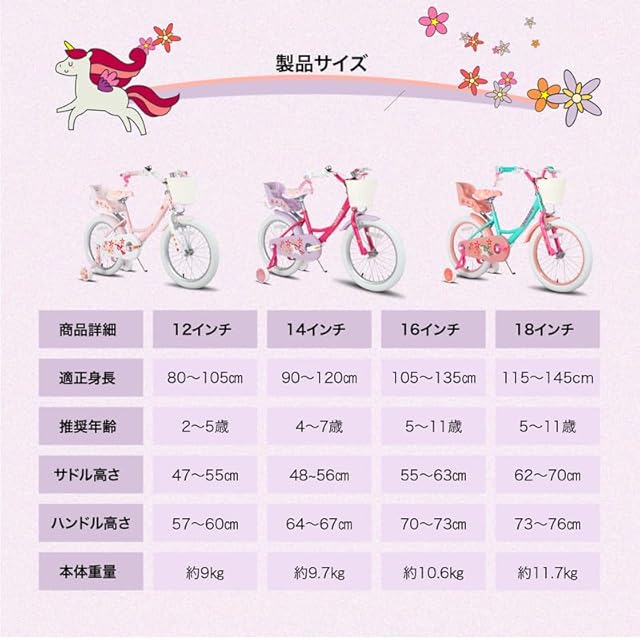 【推奨年齢・適応身長】12インチ:2~5歳、80~105㎝ 14インチ:4~7歳、90~120㎝ 16インチ:5~11歳、105~135㎝ 18インチ6~13歳、115~145cm。