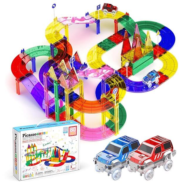 PicassoTiles 80 ピース レースカー トラック ビルディングブロック 教育玩具セット 磁気タイル マグネット DIY プレイセット 2 ライトアップ 車 STEM 学習 組み立てキット 手と目の協調 細かい運動技能トレーニング