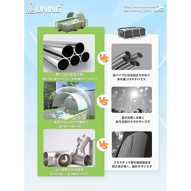 【2025新登場&フレームプール&屋根付き】LUNING社は、新しい屋根付きフレームスイミングプールを発売しました。私たちは、現在の市場でよく見られるフレームプールをアップグレードし、外観、品質、材料、機能を向上させました。厳格な選択とテストの結果、このプールが暑い夏の日にあなたとあなたの家族に素晴らしい水泳体験を提供できると信じています。