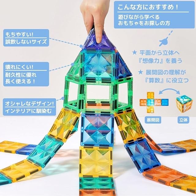 【インテリアにも馴染む、おしゃれなおもちゃ!】マグネットブロックのパーツは、特殊加工により半透明となっており、程よい厚みがあり非常に丈夫です。韓国産高品質なMABS樹脂(メーカー:LG化学)を使用しているため、軽量でありながら衝撃や汚れに強く、長くお使いいただけます。色彩も鮮やかで、光が当たると、またはライトを入れると、美しい輝きを放ち、ステンドグラスやイルミネーションのようにキラキラと輝きます。芸術的な形は子供たちの好奇心を刺激し、飽きずに楽しんでいただけます。