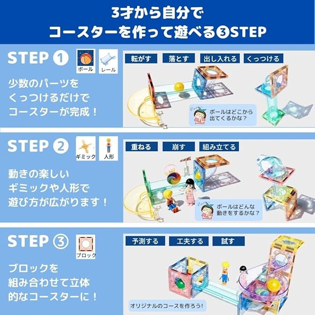 【キラキラと輝いている立体遊び知育玩具、ボール転がしおもちゃで知育】「考える」「組み立てる」「試す」「直す」の4つのステップで、子どもたちは粘り強く取り組む力と集中力を身につけます。それは同時に達成する喜びとなり、お子さまの自信へとつながります♪ ボールがクルクル回って流れ落ちる様子から、もう目が離せません!
