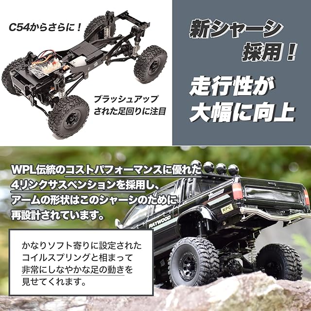 【新シャーシ採用!走行性大幅に向上】C54からさらにブラッシュアップされた足回りに注目。WPL伝統のコストパフォマンスに優れた4リンクサスペンションを採用しアームの形状はこのシャーシのために再設計されています。かなりソフト寄りに設定されたコイルスプリングと相まって非常にしなやかな足の動きを見せてくれます。
