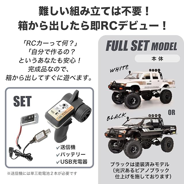 【難しい組み立ては不要!箱から出したら即RCデビュー!】組み立て済みの本体、送信機(プロポ)、バッテリー、USB充電器が入ったフルセット。RCカーって何?自分で作るの?という方も大丈夫、完成品なので箱から出せばすぐに遊べます。組み立てが不要で、送信機に単三乾電池2本を準備することで、走らせられます。本体のバッテリーはUSB充電が可能です。