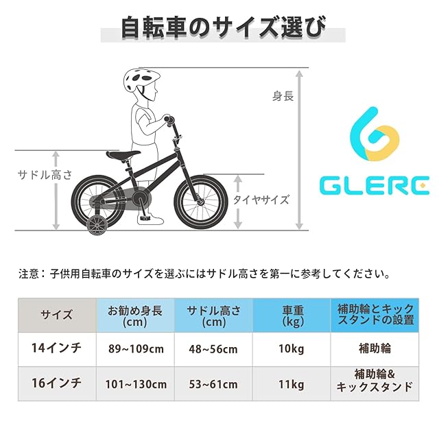 【サイズ選び】14インチ:サドル高さ(48~56cm)、お勧め身長(89~109cm)。16インチ:サドル高さ(53~61cm)、お勧め身長(101~130cm)。注意:子供用自転車のサイズを選ぶにはサドル高さを第一に参考してください。