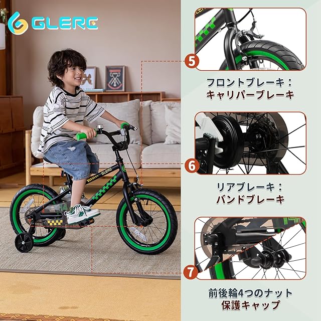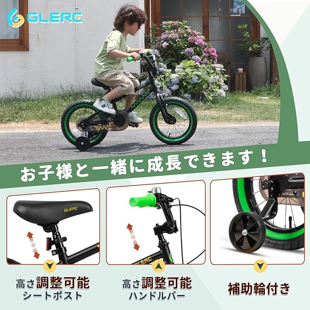 【Glerc】NuNu子ども用自転車 男の子BMXスタイル自転車 幼児乗り練習 補助輪付き 14インチ 黒/緑色