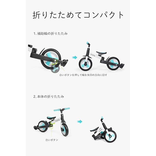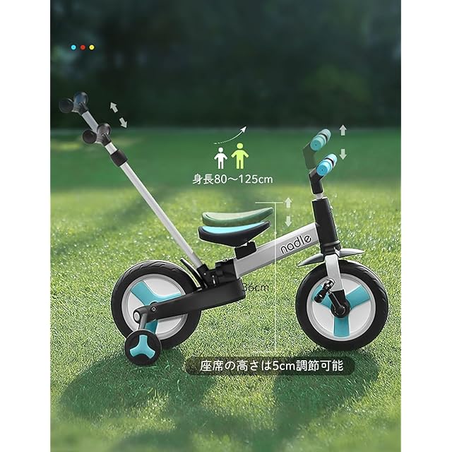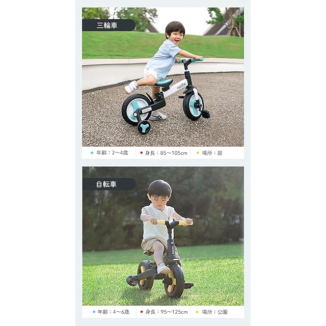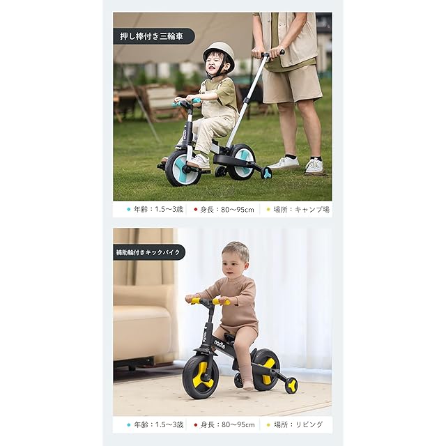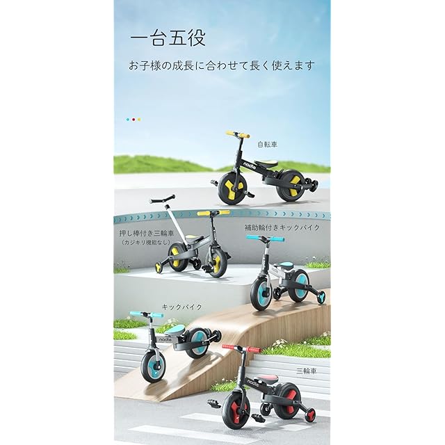 【一台四役】三輪車、押し棒付き三輪車(カジキリ機能なし)、キックバイク、補助輪付きキックバイク、自転車、5つの楽しみ方で、お子様の成長に合わせて変身できるので、長くご使用いただけます。