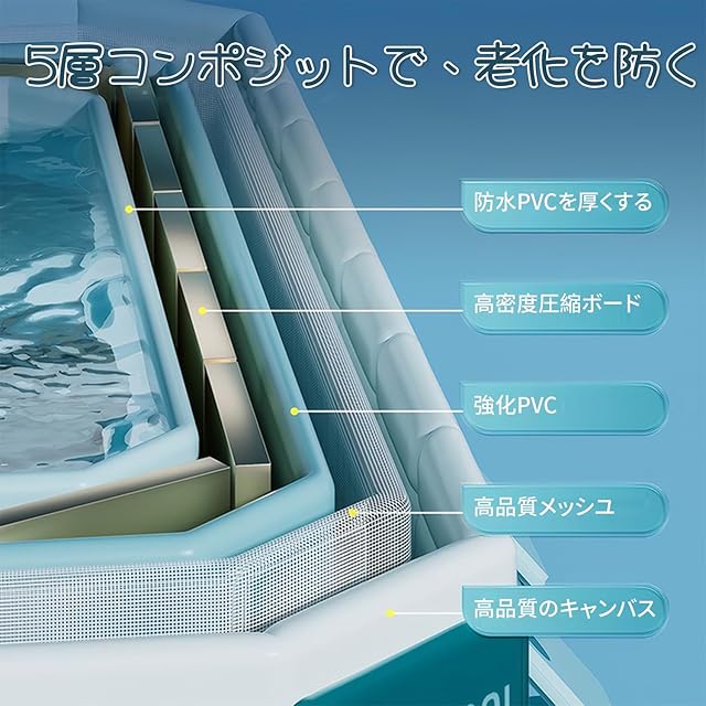 【水漏れ防止・安定した三角構造】厚さ7mmの高強度4層コンポジットでを使用し、底面には3mmの高品質PVC素材を使用しているので、耐摩耗性と耐パンク性、水漏れを防ぎ、従来のインフレータブルプールに比べて3倍以上長持ちします。側面には安定した三角形の支持板を使用し、プールの圧力や変形に強くなっているので、夏の水遊びも楽しくできます!