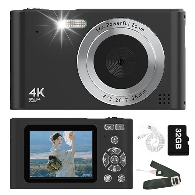 デジタルカメラ デジカメ 4800万画素 トイカメラ キッズカメラ 1080P動画撮影 16倍ズーム 手振れ補正 セルフタイマー 連写 ミニカメラ 軽量 学生 修学旅行 撮影初心者向け 32Gカード付属 (ブラック)