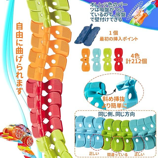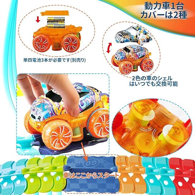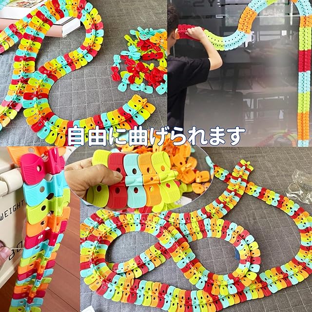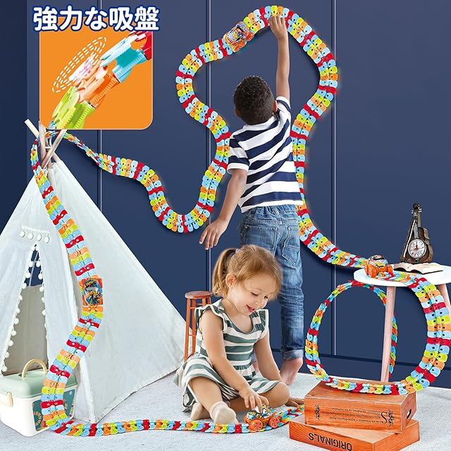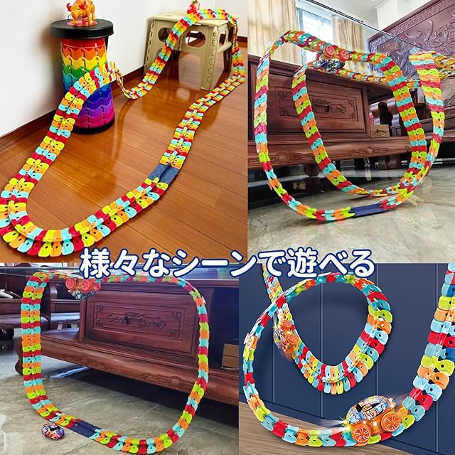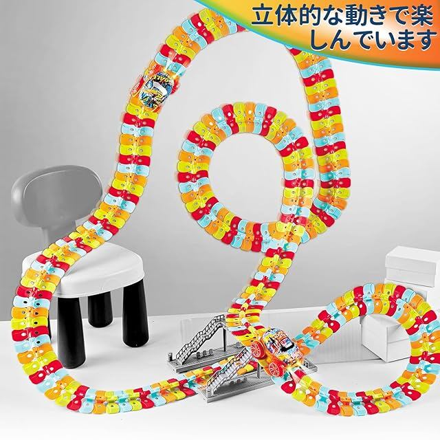 【自由な形を作れて面白い】 この商品の魅力的な点は、車がレールの上を自由自在に走り回ることができる点です。レールの組み合わせで、簡単に、車が転がる立体のコースを作ることができます、簡単です。レールは様々な形に変形させることができるため、子供たちは毎回異なるコースを作り出しては、楽しそうに車を走らせています。特に、360度ループやそびえ立つトラックなどの大胆なデザインも可能で、想像力を大いに刺激します。遊び方が無限大。単純な仕組みだが、それだけ組み合わせの自由度が高く、子供も大人も飽きない普遍的な楽しさがある。