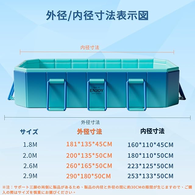 【8方向に支えられた安全構造設計】LUNING社はプールの安全性に多くの努力をしています。8角形の全体的なデザインにより、構造の安定性が向上しています。また、プール内で滑らないように、底部と両側に専用の滑り止めが設置されています。転倒や変形を防ぐために、プールの周りには8つの三角形の支持設計が採用されています。また、プールの側面を厚くし、7mmのPVC複合材料を使用しています。この厚さは他のプールの10倍です。ご注意:安全考慮のため、水量は最大容量の80%以下にしてください。支柱の数量はサイズによって異なります。