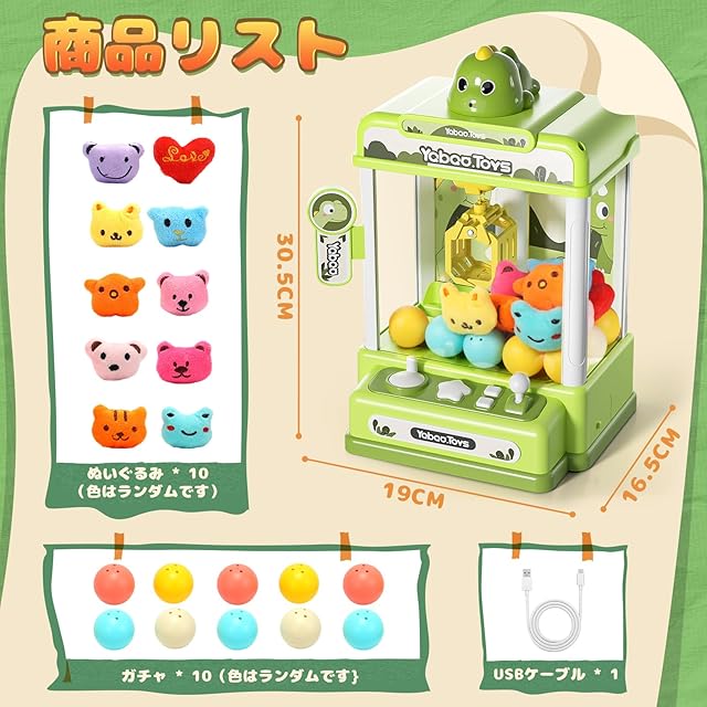 【セット内容】本体×1、USB充電ケーブル×1、コイン×24、恐竜ぬいぐるみ×6(色はランダムです)、ガチャ×16(色はランダムです)、蓄光恐竜フィギュア * 12が含まれています。