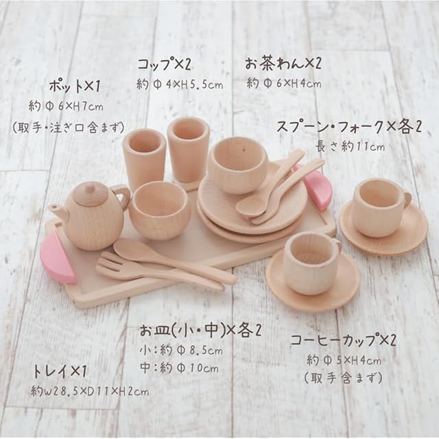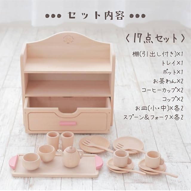 商品内容:《ピンク》棚×1個、トレイ(小)×1個、ポット(小)×1個、コップ×2個、コーヒーカップ×2個、お茶わん×2個、お皿(小)×2個、お皿(中)×2個、スプーン&フォークセット×2個