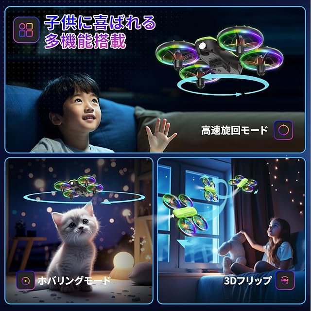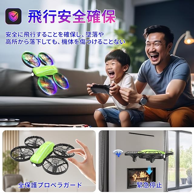 ✈【全保護カバー式】360°プロペラガード付き、お子様の手がプロペラに触れることを防ぎ、保護者の方にも安心・安全な設計になっています。また、プロペラが他の物に擦れて、プロペラや他の物に傷がつくのも防ぎ、家具の多い室内での操作に最適です。