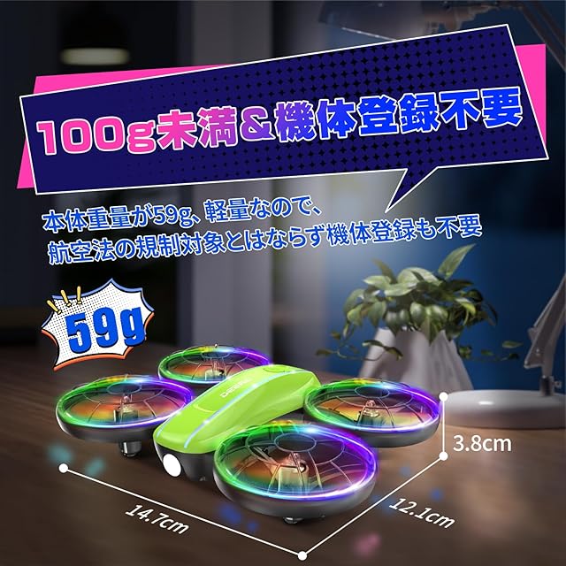 ✈【100g未満&申請不要】バッテリーを装着すると、重さがわずか59g、ドローン登録義務化の対象外製品です。届いたらすぐに遊べるので、お子様へのプレゼントに最適です。また、14.7*12.1*3.8㎝の小型サイズで、練習場所を取らず、狭い廊下でも飛行を楽しむことができます。