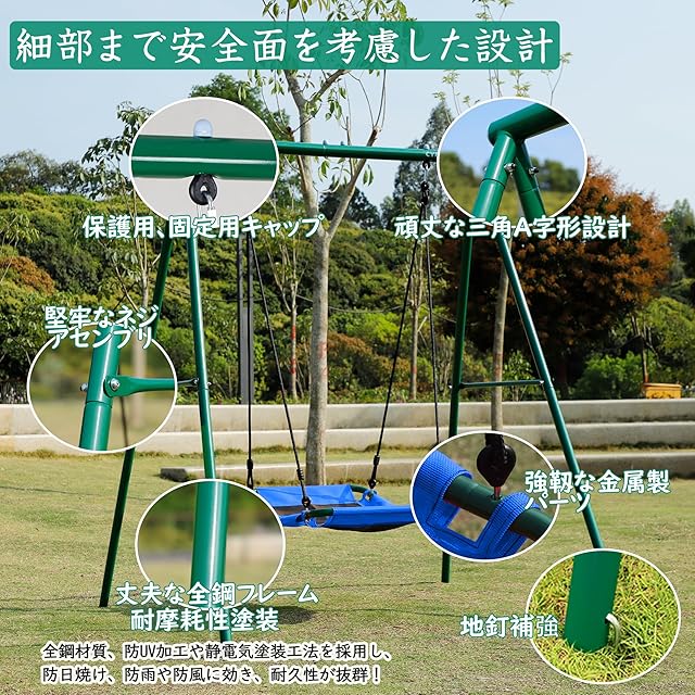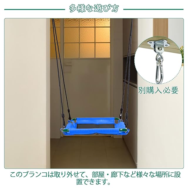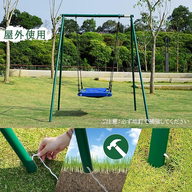 【屋外も室内も使える】このブランコはフレームから取り外せて、部屋や廊下など様々な場所にも簡単に取り付けられます。ご注意:①屋外で使用する時は必ず地釘で補強してください。②他の場所に掛けるために必要な金具は別売りです。