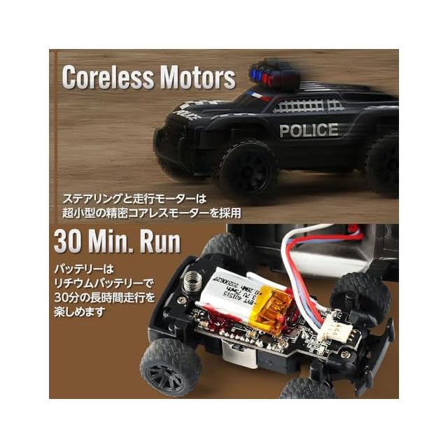 【小さいながらも力強い走り】 ステアリングと走行モーターには、超小型の精密コアレスモーターを搭載。また、コイルスプリングサスを装備することでスムーズな荷重移動を実現。思い通りのコーナリング性能を発揮します。