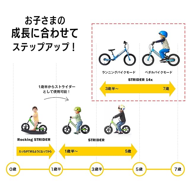 説明:14インチホイールと着脱式ペダルユニットを搭載したストライダー14xは軽量で取り回しがしやすく、お子さまのファーストペダルバイクに最適です。