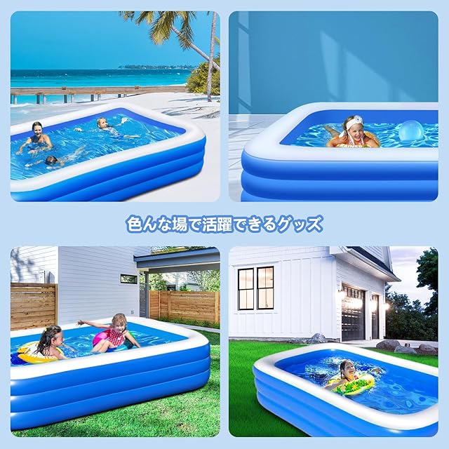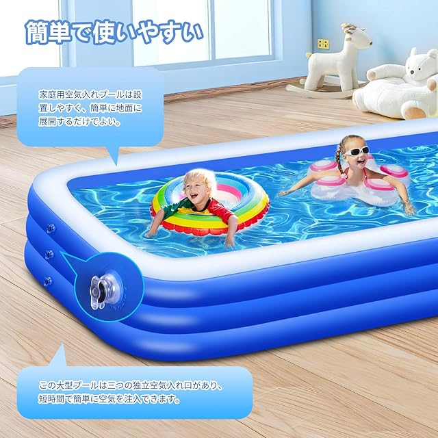 【抜群の三気室仕様】このファミリープールは、三つの気室があり、短時間で簡単に空気を注入できます。空気の偏りが起きにくく、水を溜めても安定した設計となっています。排水ホースも付いており、面倒な排水もスムーズに行え、後片付けも楽々です!水を抜く穴が貫通していない場合は、小さな穴を開けても楽しく遊ぶことができます。このファミリープールで、安心して家族みんなで楽しい時間を過ごしましょう!
