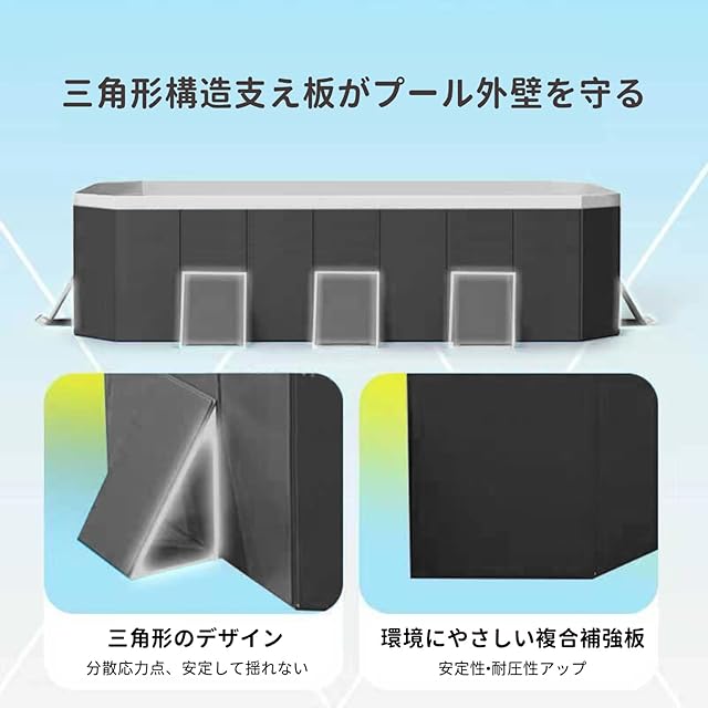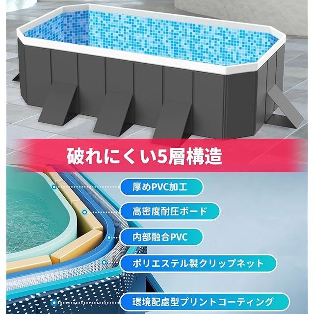 【耐久性のあるPVC素材】折り畳みプールは耐久性の高いPVC複合素材を使用しており、防水性、耐摩耗性に優れ水漏れしません。水分を吸収・浸透させず、水による劣化もしません。頑丈なチタンアルミニウムサポートで強度抜群、錆びにくく折れにくいです。安定したサポートを提供します。