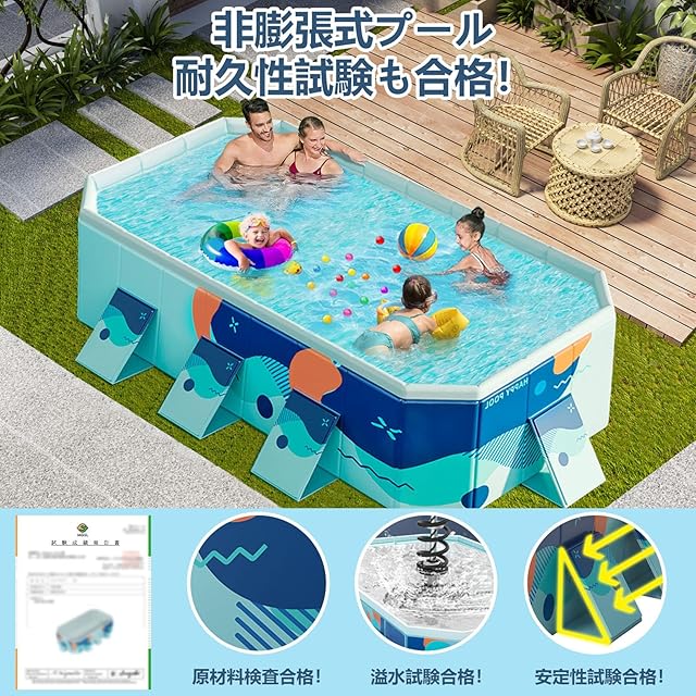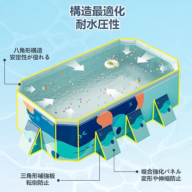 【安定構造の究極進化】安定した八角形構造に外側三角形力学サポートプレートを組み合わせ、360°立体安定構造を実現し、お子様の安全を徹底的に守ります。八角形が圧力を分散し、局部負荷を解消することができます。三角形補強板が衝撃吸収性を向上し、変形・揺れを効果防止することができます。環境に優しい厚手素材を採用しており、高い荷重耐性を誇り、家族全員で水遊びを楽しめます!