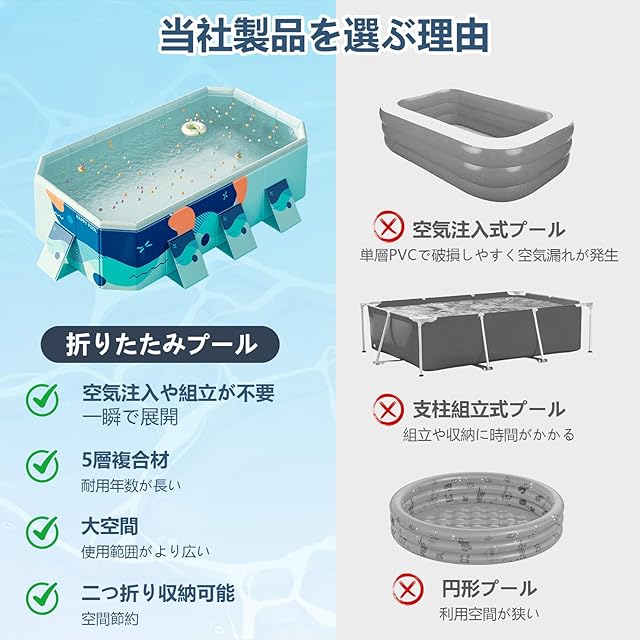 【面倒な空気入れや組み立てから解放】新型の非膨張式折りたたみ大型プールで、親子一緒に遊びながら絆を深め、充実した夏休みを過ごせます。●空気注入や組立不要 ●穴開きや水漏れの心配なし ●高価な電動ポンプ購入不要 ●使い方は簡単で、プールを広げ水位線まで水を入れるだけ ●大人が自由に体を伸ばして遊べる広さと深さ ●無毒のビニール素材(PVC)製で子供が舐めても安全。